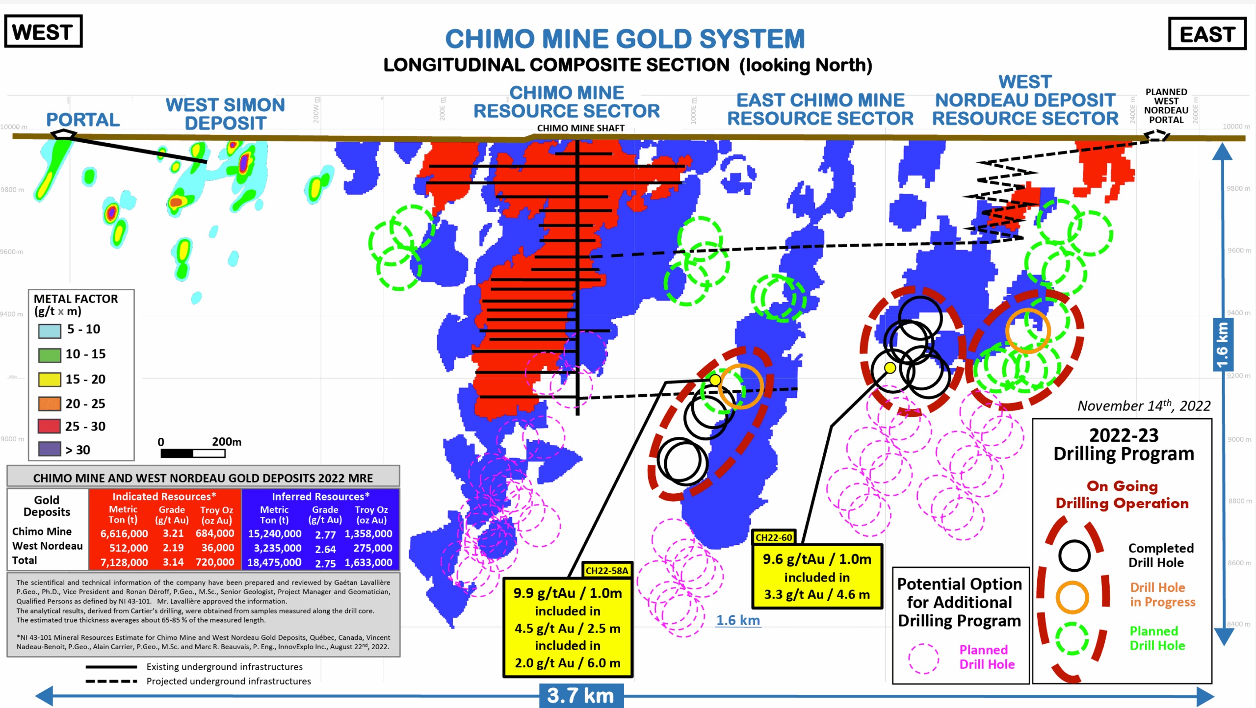 The Chimo Mine Project now consists of 29 gold zones that are situated within 19 gold structures, drilled over a strike length of 3.7 km and locally up to a depth of 1.6 km (FIGURE) where the recent mineral resource estimate, dated August 22, 2022*, reported: