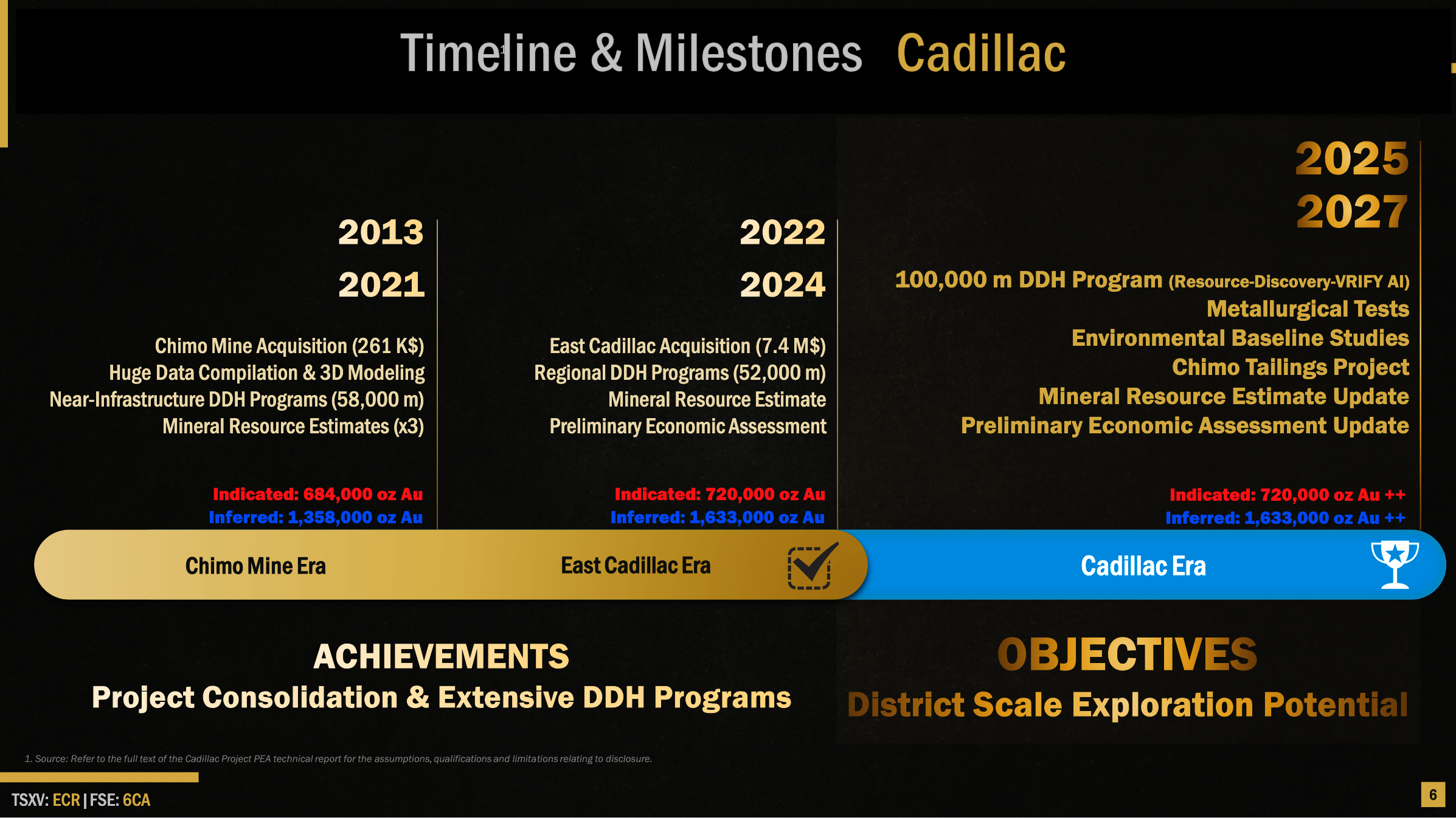 Using a gold price of US$1,750/oz, a Preliminary Economic Assessment demonstrated the economic viability of a 2-km segment, compared to the 15 km that will be the subject of the 100,000 m drilling program, with an average annual gold production of 116,900 oz over a 9.7-year mine life. Indicated resources are estimated at 720,000 ounces (7.1 million tonnes at 3.1 g/t Au) and inferred resources at 1,633,000 ounces (18.5 million tonnes at 2.8 g/t Au). Please see the NI 43-101 ″Technical Report and Preliminary Economic Assessment for Chimo Mine and West Nordeau Gold Deposits, Chimo Mine and East Cadillac Properties, Quebec, Canada, Marc R. Beauvais, P.Eng., of InnovExplo Inc., Mr. Florent Baril of Bumigeme and Mr. Eric Sellars, P.Eng. of Responsible Mining Solutions″ effective May 29, 2023.