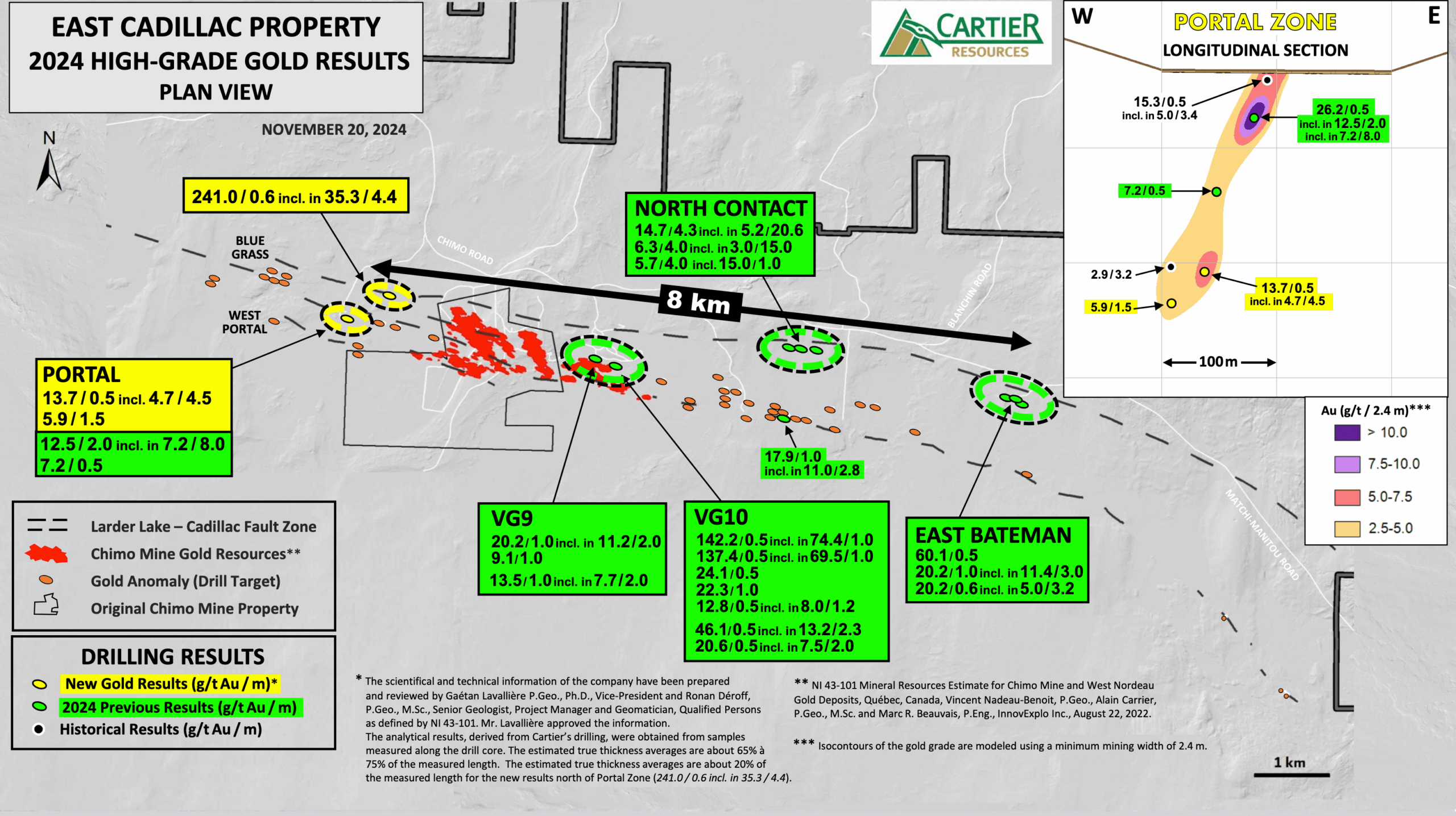 Val-d’Or, Quebec – November 20, 2024 – Cartier Resources Inc. (TSXV: ECR, FSE: 6CA) (“Cartier” or the “Company”) reports high-grade gold results in the Portal sector at its 100%-owned East Cadillac property. The latter is located 45 km east of the Val-d’Or mining camp.