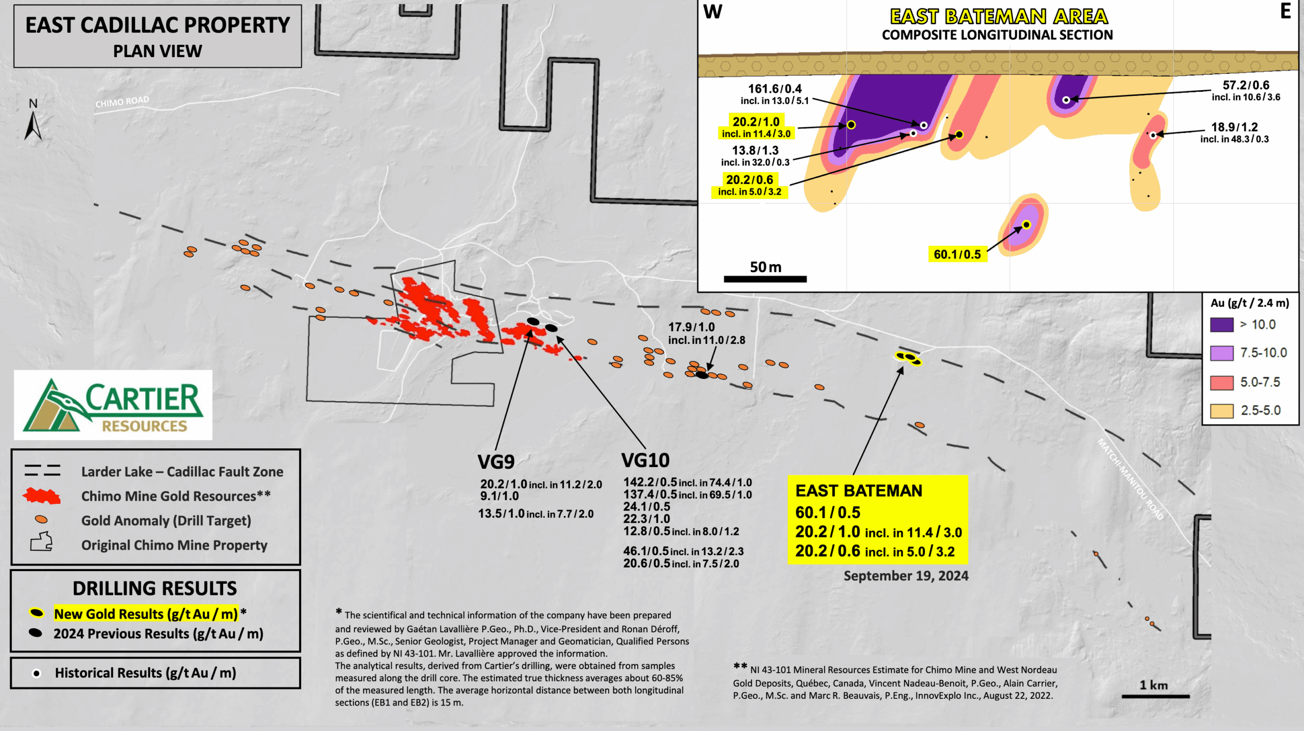 Val-d’Or, September 19 2024 – Cartier Resources Inc. (TSXV: ECR, FSE: 6CA) (”Cartier” or the ”Company”) reports high-grade gold drill results from drilling exploration on the East Cadillac property. The latter is located 45 km east of the Val-d’Or mining camp.
