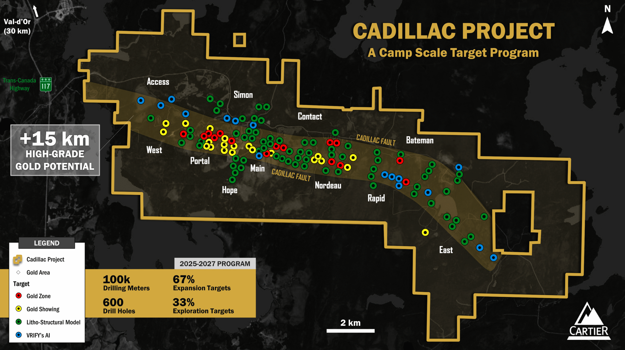 ” Following months of strategic planning and backed by detailed structural modelling and AI-driven targeting, this program will both expand known gold zones and test new high-potential targets. Leveraging insights identified through our recent exploration success and VRIFY’s AI (Artificial Intelligence), we have delineated multiple high-priority regional targets exhibiting geological signatures strongly similar to the existing zones and offer promising potential to make new discoveries. Our clear objective is to unlock the camp-scale, high-grade gold potential along the 15 km Cadillac Fault Zone, which for the first time belongs to a single company.” – Ronan Deroff, Vice President Exploration of Cartier.