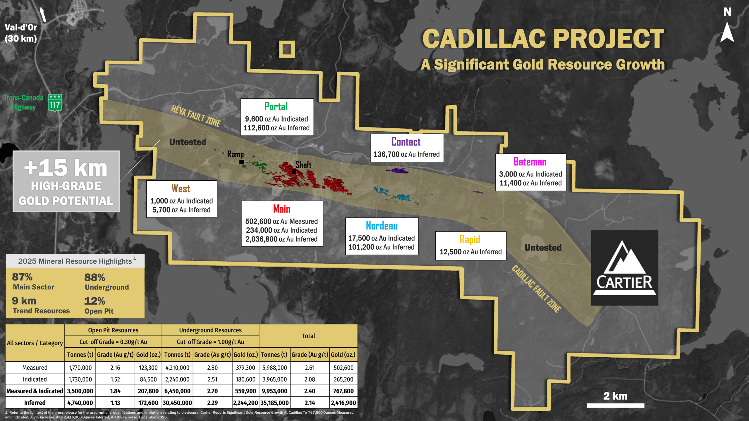 Val-d’Or, Quebec, December 18, 2025 – Cartier Resources Inc. (″Cartier″ or the ″Company″) (TSXV: ECR; FSE: 6CA) is pleased to announce the results of the Updated Mineral Resource Estimate (“MRE”) on its 100% owned flagship Cadillac Project, located in Val-d’Or (Abitibi, Quebec). The updated estimates include approximately 110,000 metres of drilling completed by Cartier from 2016 to 2024 as well as 420,000 metres drilling completed by previous mining compagnies. The MRE was independently prepared by PLR Resources Inc. and Evomine, specialists in mineral resource estimates and project evaluations, in accordance with National Instrument 43-101 – Standards of Disclosure for Mineral Projects (“NI 43-101”) and is dated December 17, 2025.