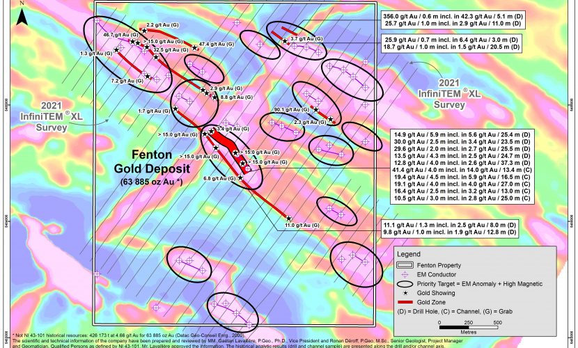 The choice of the InfiniTEM® XL of Abitibi Geophysic Inc.’s method is based on its ability to detect mineralization, consisting of semi-massive to massive sulphides, weakly conductive such as pyrite in a silica matrix. The first configuration, totaling 15 km of survey, aims to detect the presence of mineralization located in the deep extension of the Fenton deposit, between 500 m and 1,000 m deep. The second configuration, totaling 65 km of survey, aims to discover new mineralized zones peripheral to the Fenton deposit (FIGURE), at depths between 100 and 500 m. The geophysical survey will be completed by Christmas 2021 and the interpretation of the results, used to generate a large portion of the 2022 drill targets, will be available at the end of January 2022.