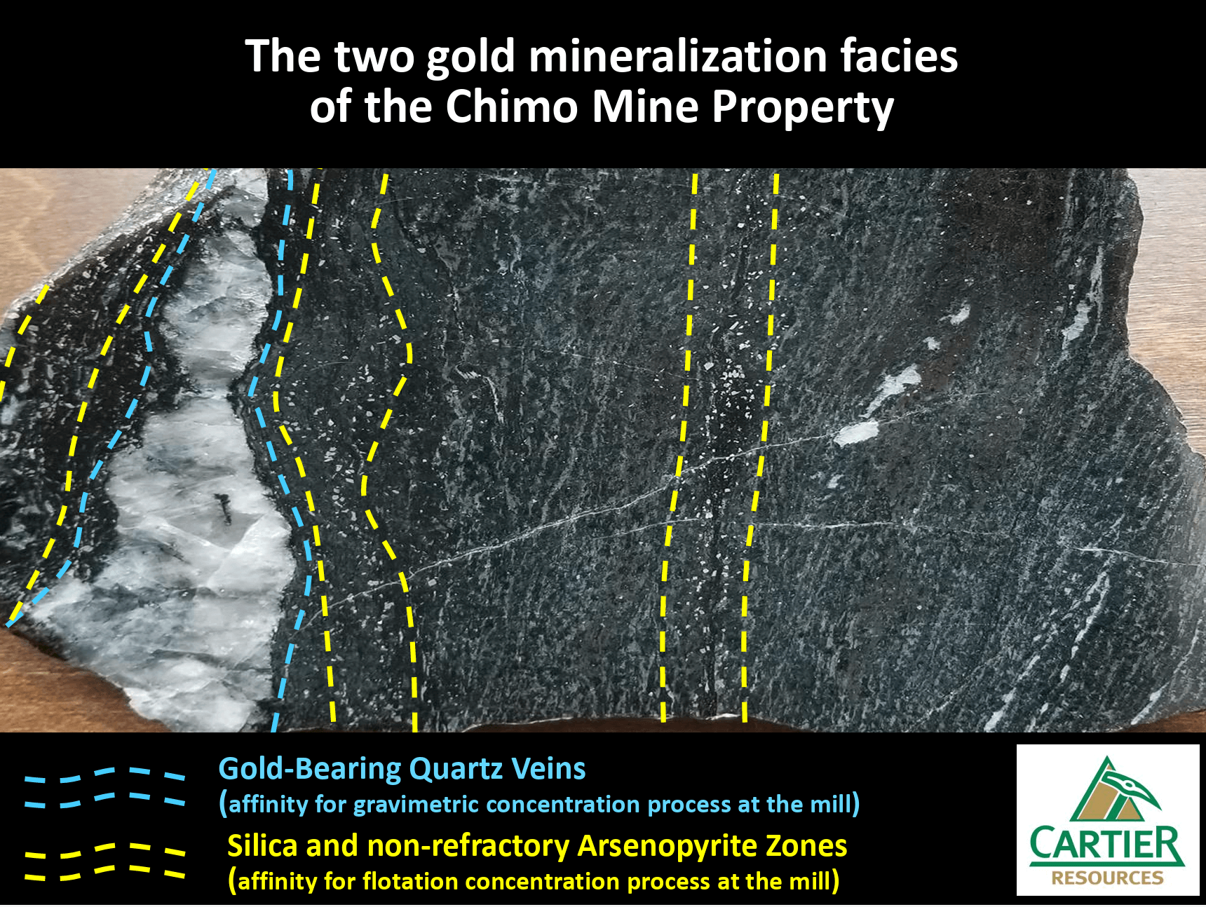 Gold from the Mine Chimo property is present in two types of mineralised facies (FIGURE) either : i) quartz veins with coarse visible gold grains having an affinity for the gravity concentration of gold at the mill and ii) zones of silica-rich mafic rocks associated with non-refractory arsenopyrite having an affinity for the flotation of a concentrate of arsenopyrite for gold recovery at the mill. To perform the sorting tests, rocks representative of the 2 mineralised facies, made up of the following 6 mineralogical facies, were first selected for static recognition of each of the facies by the sensors of the sorter: